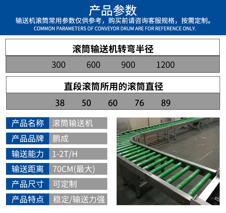 詳細信息 商品屬性 訂貨號PC6633 加工定制是 貨號PC 類型滾筒輸送機 品牌鵬成 型號600/800 輸送能力強(t/h) 功率90(KW) 輸送距離1000(m) 外形尺寸多種規格(m) 重量每單元約55(kg) 適用領域物流分揀貨物裝車神器 是否跨境出口專供貨源否