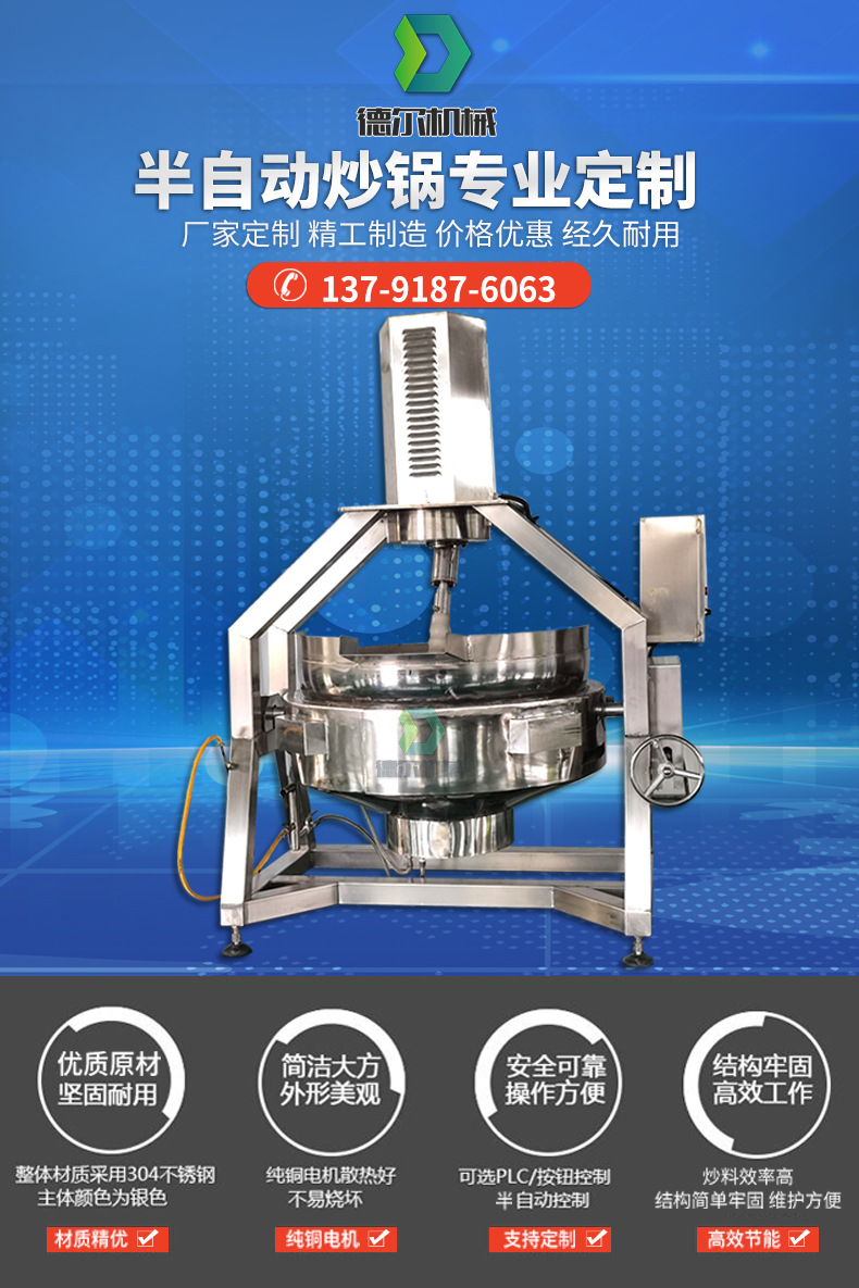 詳細信息 訂貨號DR-BZD300 加工定制是 貨號DR-BZD300 種類預煮機 品牌德爾 型號DR-BZD300 功率1.5(kw) 電壓380(V) 外形尺寸1500*1500*1900(mm) 產品用途物料攪拌炒制 凈重500(kg) 包裝纏繞膜 立式行星攪拌炒鍋 火鍋底料炒料機 半自動炒鍋中央廚房炒菜機 您剛好需要,我們正好專業 合作只是開始,服務永無止境