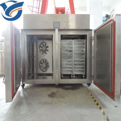 工作原理:速凍機主要是由制冷系統(tǒng)、推進系統(tǒng)、電氣控制系統(tǒng)及速凍室等所組成的;工作人員將裝有待凍食品的凍品盤通過速凍入口進入速凍軌道并在人力的作用下向出口方向步進移動,在移動的過程中,經過一個由風機的作用下形成一個穩(wěn)定的垂直環(huán)狀低溫氣流,這個低溫氣流與水平運動的被凍食品進行熱交換,從而實現(xiàn)快速降溫凍結過程。