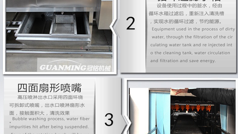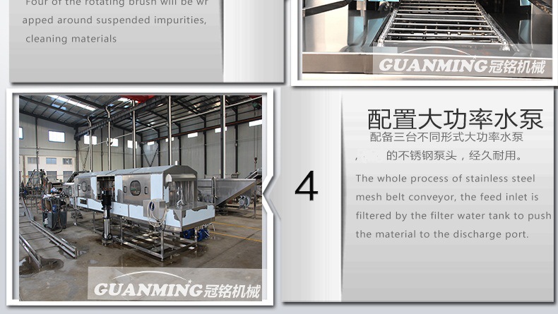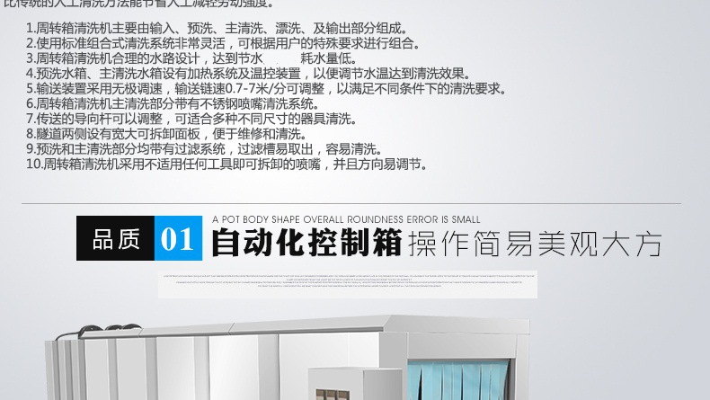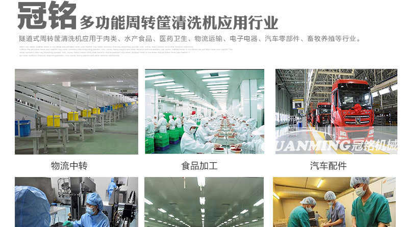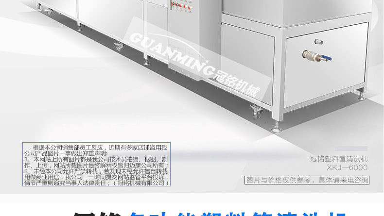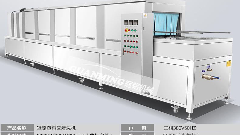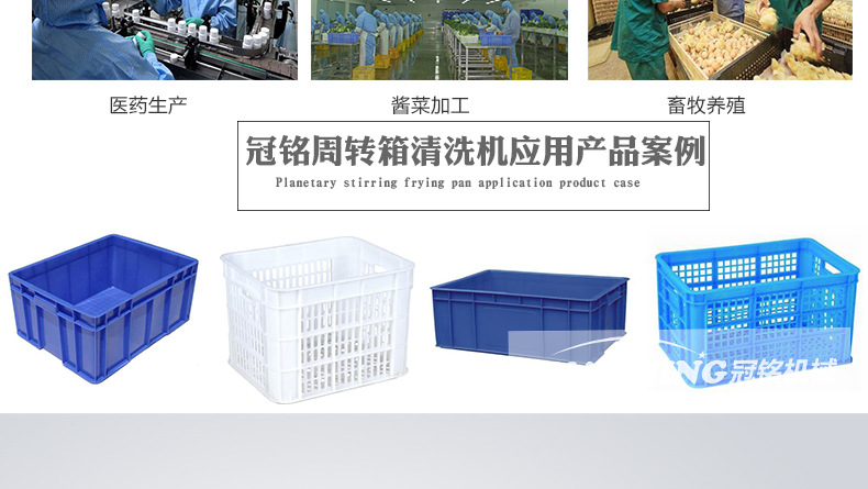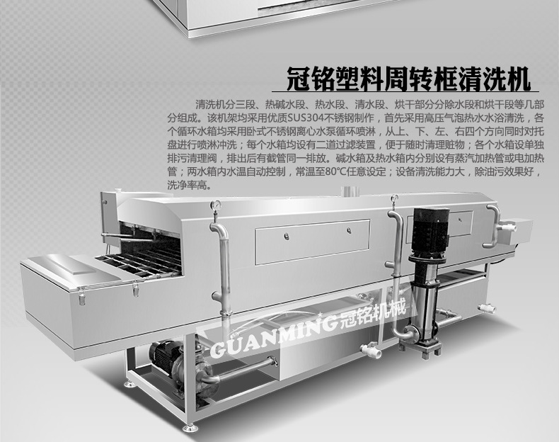 諸城市冠銘機械有限公司定制生產周轉筐、塑料箱、托盤、料桶等清洗機,設備模擬人工清洗的基本動作,有效避免了清洗過程中產生的磕碰、劃傷等物料的損傷現象,大大提高工作效率。