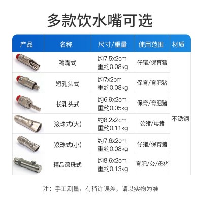 產品規格不銹鋼短乳頭式飲水嘴,不銹鋼滾珠式飲水嘴大號,不銹鋼滾珠式飲水嘴小號,不銹鋼精品滾珠式飲水嘴,不銹鋼鴨嘴式飲水嘴,不銹鋼長乳頭式飲水嘴