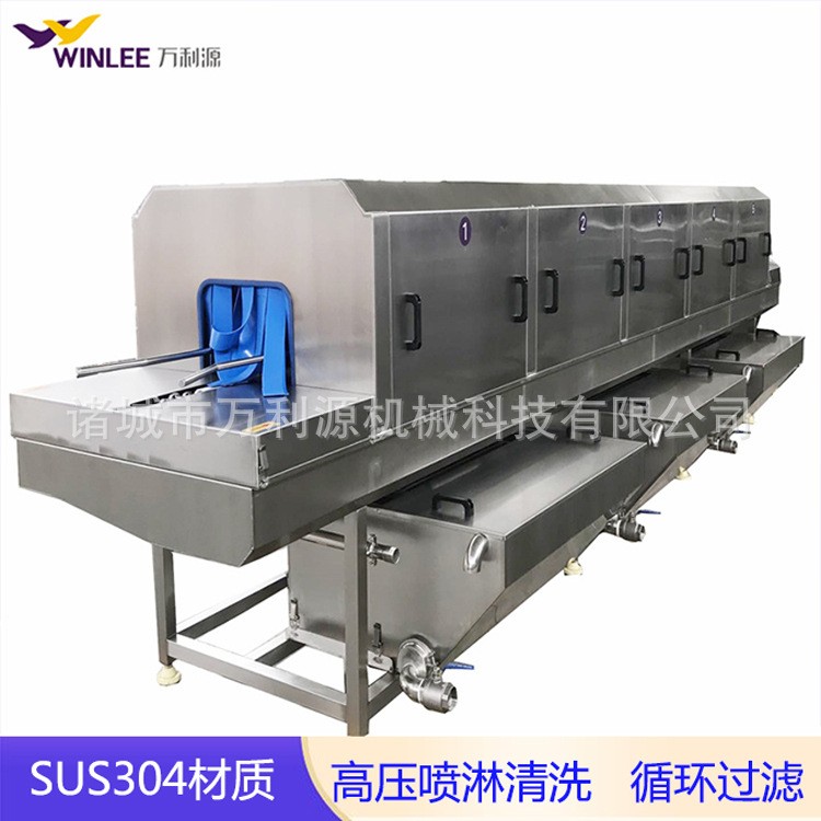 該機(jī)整體采用SUS304不銹鋼材料制作,采用不銹鋼熱水清洗泵,能夠替代傳統(tǒng)的人工清洗作業(yè),滿足不同食品企業(yè)的大量周轉(zhuǎn)箱的清洗要求。本機(jī)性能可靠、運(yùn)行平穩(wěn)、安裝維修簡單,具有生產(chǎn)效率高、清洗效果好、能耗低、使用壽命長等特點(diǎn)。此外,還可根據(jù)客戶的不同要求制作各種不同規(guī)格的周轉(zhuǎn)箱(盤)的清洗機(jī)。
