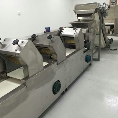 面條機(jī)是結(jié)合多年的傳統(tǒng)模式和現(xiàn)代工藝,而研發(fā)的全自動(dòng)壓面機(jī),整機(jī)結(jié)構(gòu)先進(jìn),操作方便,安全耐用,低噪音,工作效率高,外形美觀,節(jié)約人工,凡接觸食物的部分,均采用不銹鋼SUS304材質(zhì)和PU輸送帶構(gòu)成。符合國(guó)家衛(wèi)生標(biāo)準(zhǔn)。適用于賓館,飯店,食品加工工廠,單位食堂,及個(gè)體制作面食之用。 和面: 全采用SUS304材質(zhì)臥式和面桶、動(dòng)力強(qiáng)勁、減速電機(jī)、高轉(zhuǎn)速、低運(yùn)轉(zhuǎn)、靜態(tài)和面,對(duì)所加工的面粉反復(fù)揉搓,達(dá)到顆粒狀、均勻化、不發(fā)熱、不粘連、不破壞面筋。和面時(shí)間可以自由設(shè)定,和面完成后會(huì)自動(dòng)卸料,進(jìn)入醒發(fā),熟化過(guò)程,操作簡(jiǎn)單,安全,易懂,和面容量可供你選擇(50—200kg)分為單軸和雙軸攪拌, 壓面: 第一道采用斜紋式滾輪成行面帶,不打滑、不粘連、不斷裂、自動(dòng)輸送,帶有自動(dòng)復(fù)合與人工復(fù)合雙模式。供你選配。復(fù)合式充分發(fā)揮面筋的力量,大大增加了面條的壓力和性能的強(qiáng)度,達(dá)到光滑、通透、韌性、咬勁、耐煮的效果。 在延壓過(guò)程中,我們采用變頻調(diào)速,光電跟蹤,實(shí)現(xiàn)生產(chǎn)線(xiàn)同步運(yùn)行。 折皮: 一機(jī)多用功能附帶皮子機(jī),不但可以做各類(lèi)面條,還能完成皮子生產(chǎn),(例如:水餃皮、云吞皮、抄手皮、春卷皮等)產(chǎn)量高,可自由設(shè)定張數(shù),超薄皮可達(dá)(0.4mm厚)帶有自動(dòng)雙面撒粉器,噴灑均勻,不漏粉,自動(dòng)處理粉漬,撒粉的多少可自由調(diào)節(jié)。 切面: 面條成形是產(chǎn)品的重要組成部分,此機(jī)采用計(jì)數(shù)器,電子解碼器,切面的長(zhǎng)短,可以自由設(shè)定,自動(dòng)切斷采用高精密度滾刀式,勁久耐用,帶有輸送平臺(tái),可供多人撿面操作,成形刀具可根不同的面條尺寸形狀定制,互換。 面刀: 采用特殊不銹鋼材質(zhì),高精度、加工而成。軸承裝配,不用加油,不生銹,切面無(wú)毛刺,經(jīng)久耐用、通常不人為損壞,正常使用壽命在3—5年。 刀具選配:方形刀、圓形刀、刀削面刀,異形刀(尺寸從0.6—7.2mm)